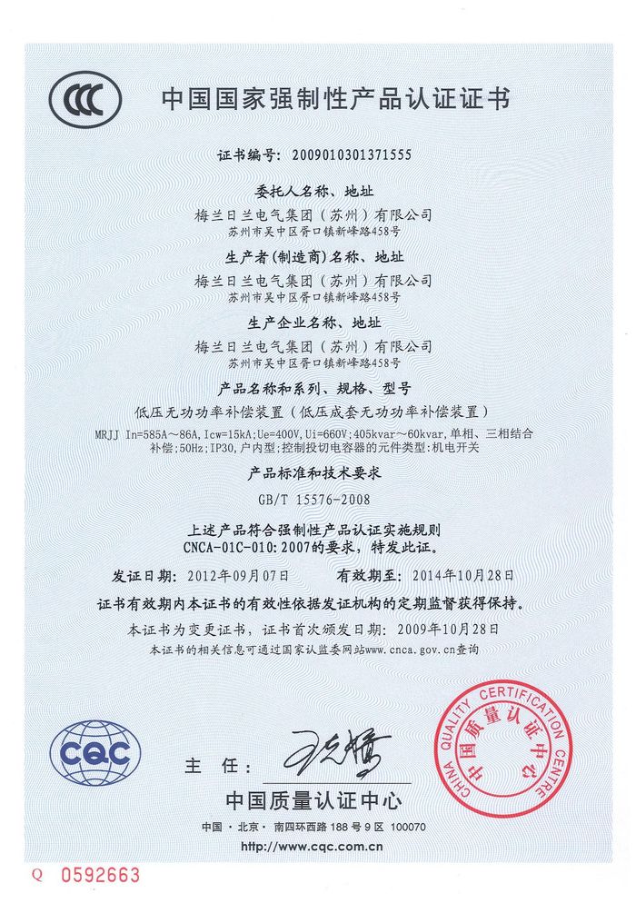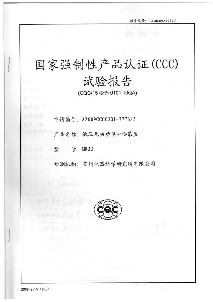 (成套)MRJJ無(wú)功柜資質(zhì)證書(shū)