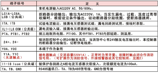 | ILIA. ILIB | 漏電輸入端,接零序互感器的輸出端。 RS485通訊口,TA、TB為485信號(hào)線,GND為信號(hào)地 |