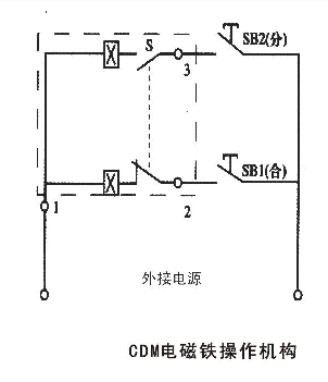 CDM電磁鐵操作機(jī)構(gòu)(配用MRMl-63,100,225)接線圖見(jiàn)下圖(虛框內(nèi)為斷路器外符號(hào)說(shuō)明:SBi、SB2操作按鈕(用戶自備)